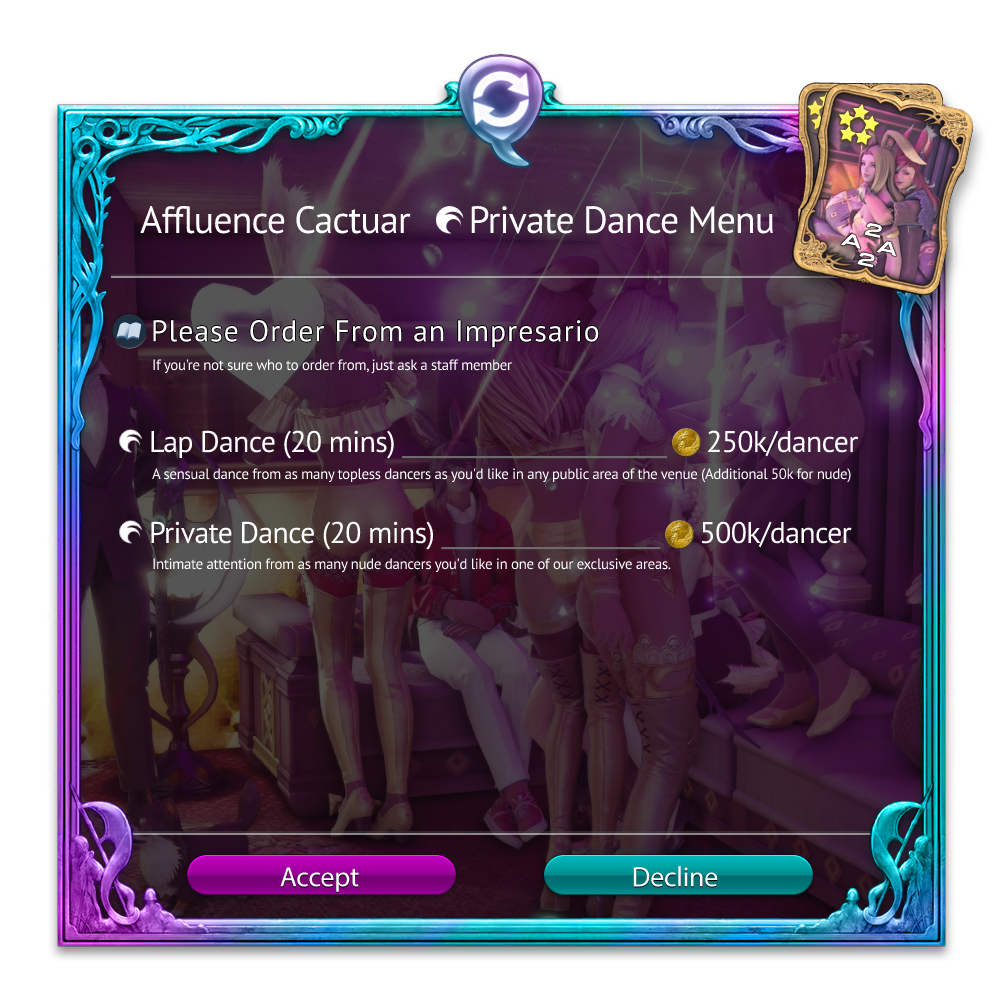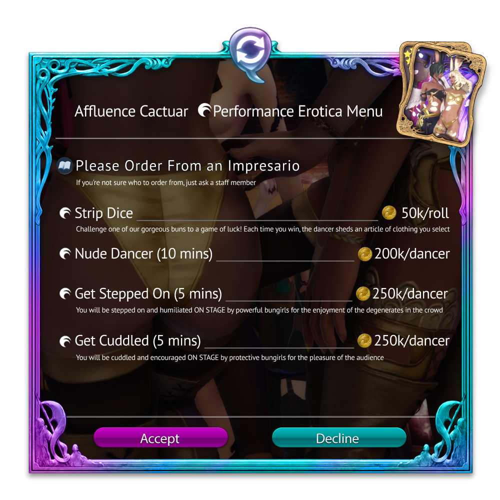 Satisfy your desire for luxury at Affluence. Tantalize your taste buds with fine dining, or feast your eyes on our angelic pole dancers. Relax in our hot tub, or the upscale balcony.If you want something a little more intimate, take a look at our performance erotica menus. And if you're looking for unlimited indulgence, perhaps you might like a look at our VIP service.Many and more delights await you at Affluence.